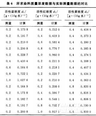 根據建立的數學模型,利用牛頓迭代法反求染料質量濃度,并與實際測量的染料質量濃度進行對比,其結果見表6所示。根據表6可以看出,根據建立的數學模型求出的RGB值與實際測量的RGB值之間的誤差在誤差允許范圍之內。說明最小誤差平均值擬合法能夠較好地解決計算機染色配色的問題。