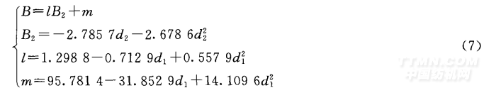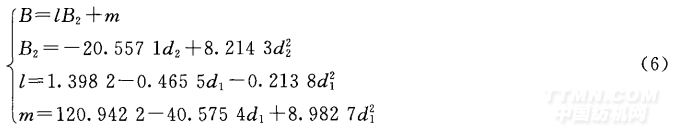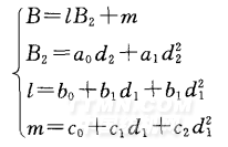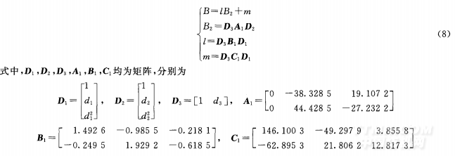 其中,a0,a1,b0,b1 ,b2 ,c0,c1 ,c2是關于d3的函數,可以求出各系數與d3的線性關系式。 綜上可得,B與3種染料濃度的關系函數為
