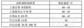 較適宜的活性染料有乙烯砜型染料(55℃),一氯均三嗪/乙烯砜型雙活性基染料(60~70℃),一氟均三嗪/乙烯砜型雙活性基染料(55~60℃)。