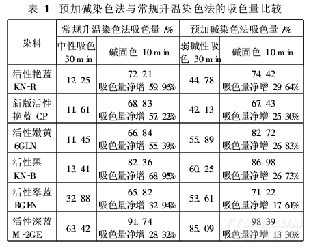 (2)第二類 在中性鹽浴(吸色浴)中,一次吸色量低,但對堿敏感,加堿固色初期染料的凝聚現象與驟染現象十分嚴重,容易造成染色質量下降。這類染料不適合常規升溫法染色,而適合預加堿法染色。如活性艷藍KN-R、活性嫩黃B-6GLN和活性黑KN-B等。預加堿染色法可使織物在弱堿性(pH值=10)浴中吸色。由于活性染料在堿性條件下親和力較大,故一次吸色量可顯著提高。由于染液濃度在加堿前大幅下降,染料的凝聚與驟染現象在加堿后都得到了緩解,可有效消除染料性能缺陷造成的質量問題預加堿以1 g/L為宜,用量過多,會因pH值過高,影響吸色的均勻性,其對比試驗數據見表1。