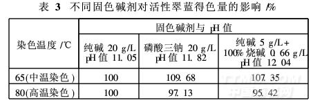 據檢測,常用中溫型活性染料染深色的電解質最高用量以<70 g/L為宜。若電解質用量>70 g/L,則得色深度提高不多,反而會加重加堿固色初期染料的凝聚程度,對染色質量產生負面影響。