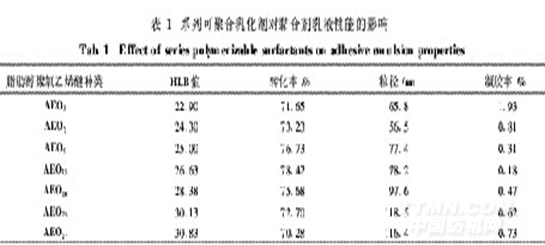 在乳液聚合體系中,可聚合乳化劑的作用是使油相單體乳化形成具有增溶作用的膠束粒子,并在聚合反應過程中穩定乳液粒子以及防止乳液聚合時產生凝膠。可聚合乳化劑的親水親油平衡值(HLB值)不同,對油相單體乳化及乳液粒子的穩定作用也就不同。在單體質量分數為20%(占乳液組成百分比)、引發劑用量為1%(對單體重)和聚合溫度為75℃條件下,研究了不同HLB值的系列馬來酸酐脂肪醇聚氧乙烯醚單酯化物對乳液性能的影響,結果如表1所示。