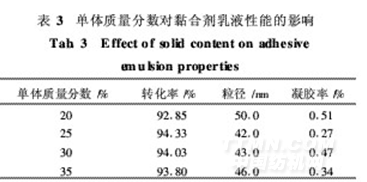 乳液聚合體系中單體質量分數大時,由于粒子表面存在水化雙電層,使得粒子之間的運動阻力加大,黏度增大,從而影響乳液的穩定性能,因此,在可聚合乳化劑用量為8%、引發劑用量為1%和聚合溫度為75℃的條件下,研究不同單體質量分數對黏合劑乳液性能的影響,結果如表3所示。