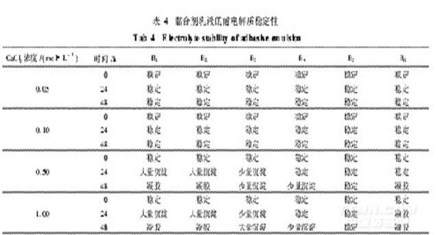 以不同馬來酸酐脂肪醇聚氧乙烯醚(15)單酯化物用量制得的黏合劑乳液試樣B1~B5及乳化劑TX-30和SDS所制得的黏合劑乳液試樣B6對不同濃度CaCl2穩定性能的測試結果如表4所示。