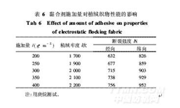 黏合劑的主要作用是連接絨毛和底布,其施加量直接影響植絨織物的植絨牢度、斷裂強度、透氣性和手感等。在焙烘溫度為155℃,焙烘時間為5min的條件下,研究黏合劑施加量對植絨織物植絨牢度和斷裂強度的影響,結果如表6所示。