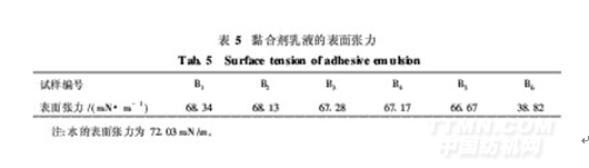 在無皂黏合劑乳液聚合體系中,可聚合乳化劑與主要反應單體進行共聚。如果可聚合乳化劑已完全共聚到聚合物上,則聚合物乳液的水相中不含游離的可聚合乳化劑,聚合物乳液水溶液的表面張力應接近水的表面張力。故可通過測定乳液水溶液的表面張力[10-11]來定性地判斷可聚合乳化劑參與聚合的程度。由可聚合乳化劑制備的黏合劑乳液的表面張力測試結果如表5所示。從表5可見,由可聚合乳化劑所制備的黏合劑乳液的表面張力與純水相近(66·67~68·34mN/m),但比可聚合乳化劑水溶液在濃度于CMC值以上的表面張力(40·54mN/m)要高許多,說明只有很低濃度的可聚合乳化劑存在于水相中。而由傳統乳化劑SDS和TX-30制得的乳液其表面張力(38·82mN/m)與水溶液的表面張力(33·46mN/m)非常接近,說明SDS和TX-30以物理方式吸附在乳液粒子表面。