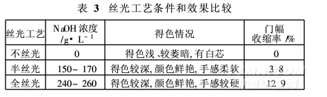 絲光加工不僅可以提高織物的尺寸穩定性,還可以提高苧麻纖維的染色性能。我們對不絲光、半絲光和全絲光三種工藝進行了對比試驗,見表3。