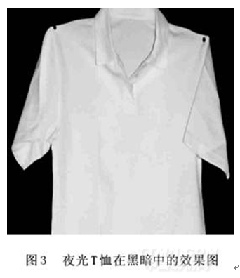夜光纖維制成的紡織品在白天與普通纖維具有完全一樣的使用性能,不會使人感到有任何特異之處。更重要的是,它的發光成分已經分散于纖維分子之中,發光特性不會受水洗的任何影響。圖3所示為針織T恤在黑暗中的效果圖,該T恤由白色夜光纖維制成。