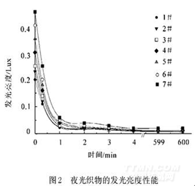 該纖維只要吸收任何可見光10min,便能將光能蓄貯于纖維之中,在黑暗狀態下持續發光10h以上,且可無限次循環使用。其光的顏色有紅光、綠光、黃光、藍光等,光的亮度也有多種。其發光亮度隨時間的變化規律如圖2所示。