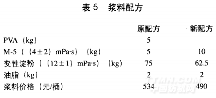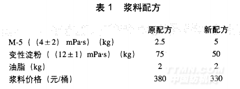 (3)洗水退漿性。牛仔布上的漿料無論在縫制前后, 都要進(jìn)行退漿(水洗)。如果在相同的上漿率的情況下,越 是容易退漿的漿料,對(duì)后道的生產(chǎn)工序越有利。 綜上所述,經(jīng)過多次的漿料選擇、配方的選擇和生產(chǎn) 試驗(yàn)、測(cè)試對(duì)比、分品種推廣等等步驟,優(yōu)化后的漿料配方 是常規(guī)的變性淀粉、M一5紡織漿料及油劑。