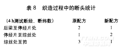 ①從織機的生產(chǎn)效果上看,經(jīng)向斷頭相比與過去明顯的減少,特別是筘座到綜絲處,說明經(jīng)紗的耐磨性有所提 高。
