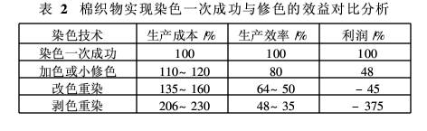 表2列示了染色一次成功與修色、改色重染、剝色重染的生產成本、效率和利潤的對比。