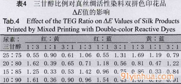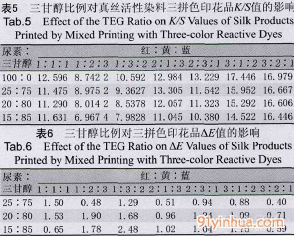 取尿素與三甘醇的混拼比例為25:75、20:85,和l 5:85,調制經3只活性染料以不同比例混拼后的色漿對真絲織物進行印花,印花后測得的K/S值與色差△E值如表5和表6所示。