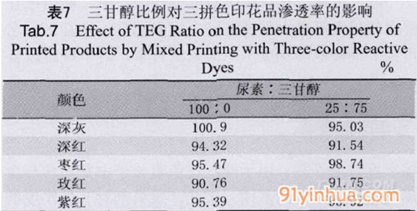 由表5和表6 得,對于染料三原色的三拼印花,三甘醇所占比例為75%時的色深度相對全尿素的最為接近,色差值大都在1.0以下;而80%和85%時的色深度與全尿素的 相比均有較大程度的下降,并且色差值也大都在1.0以上,所以很明顯地得出三二甘醇含量為75%時更可取,即尿素與三甘醇的最仕混拼比例為25 :75。