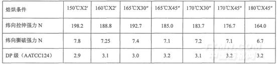 由上表數據可知,在溫度160℃-170℃,焙烘時間45秒時,可達到較好的平服度,再提高溫度,平服度增加不明顯,強力損失較大。最佳的溫度與時間為165~170℃45秒。