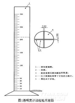 透明度計(jì)(玻璃長(zhǎng)管)法測(cè)試過(guò)程:將制備好的樣液倒人透明度計(jì)的容器中,慢慢升高容器位置,使樣液通過(guò)軟管進(jìn)人帶刻度圓筒,并使液面逐漸升高從圓筒頂部向下觀察底部的黑色雙十字線(xiàn),直至其消失,再略向下移動(dòng)容器,使雙十字線(xiàn)重新出現(xiàn),并剛好能看清楚,記錄此時(shí)液面在圓筒上的刻度,即為該樣品的清潔度。