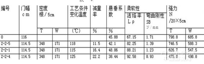 試驗(yàn)的減量率、懸垂系數(shù)、活絡(luò)率、彎曲剛性強(qiáng)力等數(shù)據(jù)見(表一)。