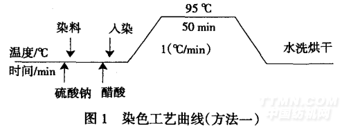 工藝配方為:(蘭納素紅2B)=2%,(元明粉)=15%,用醋酸調pH值至4,浴比(質量比)為1:50。