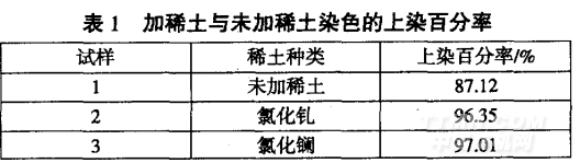 (1)分別改變稀土種類和稀土的用量,觀察其對染色性能的影響。按上面所述工藝進行染色實驗,在染色進行到一半時分別加入氯化釓和氯化鑭稀土溶液,實驗對比兩種稀土的上染百分率。加稀土和未用稀土染色的上染百分率對比如表1所示。