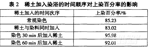 由表2可知,稀土與染料同時加入時的上染百分率反而低 于常規染色不加稀土時的上染百分率。這是因為在溶液中過早 加入稀土,會使染料分子在未上染纖維前,先與稀土離子生成溶 解度較低的螯合物,降低了染料的濃度,影響了對羊毛纖維的上 染,從而使上染百分率下降;在染色30 min后加入稀土,羊毛纖 維的上染百分率最高,這是因為此時已有部分染料上染了羊毛 纖維,稀土離子和溶液中剩余的染料和羊毛纖維形成了穩定的絡合物,從而促使染料上染,提高了上染百分率。