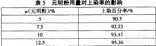 (5)元明粉的用量對上染百分率的影響。仍根據以上工藝, 改變元明粉的用量,其對上染百分率的影響如表5所示。