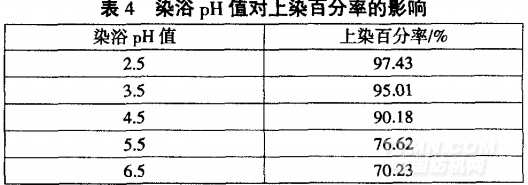 (4)染浴pH值對上染百分率的影響。根據以上工藝,仍在染色進行到一半B,-t;~u人稀土溶液,調節不同的pH值,記錄在不同pH值條件下上染百分率的變化。染浴pH值對上染百分率的影響見表4。