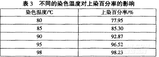由表3可知,上染百分率隨著溫度的升高也逐漸升高,溫度達98℃時上染百分率達到最高。