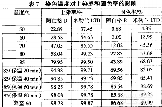 染色溫度對上染率和固色牢的影響見表7。由表7 可知,米勒蘭LTD從低湍時就開始逐步發揮促染作用,隨溫度升高,上染 率和固色率均快速增加。當溫度升至80℃時,加米勒蘭LTD的 上染率達99.23%,而加阿白格B的上染率僅達58.04%;加米勒 蘭LTD的固色率達57.68%,而加阿自格B的固色率僅達 22.85%。因此,加米勒蘭LTD可以使羊毛低溫染色效果明顯。實 驗后還發現,染淺色時80℃上染率就達最高,染中深色時在85 ℃~9o℃時,上染率仍在上升,但增加幅度有限。當溫度達85℃ 并保溫后,染料的吸附和固色已經基本達到平衡。因此實際染色時選用85℃,保溫60min。
