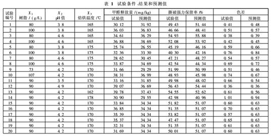 用中心旋轉法設計了樹脂用量、整理液pH值和焙烘溫度等三個變量、五個水平的20個試驗[2],試樣的釋放甲醛量、緯向撕破強力保留率及色差的試驗值和經中心旋轉法二次回歸[3]分析后的預測值見表1。