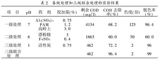 根據上述各級處理的最優條件和最佳投加量對廢水進行了處理,實驗結果見表2.