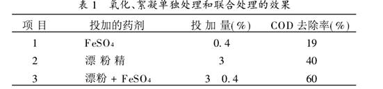 從圖可看出,FeSO4的最優投加量為0.4%,而漂粉精用量越大處理效果越好,但投加量超過3%后,增效較慢.從節約成本角度考慮,確定漂粉精的投加量為3%.單獨用FeSO4或漂粉精處理和氧化-絮凝聯合處理的實驗結果比較見表1