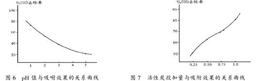 印染廢水經過上述二級處理后,剩下的是一些小分子有機物,這些小分子有機物難以絮凝和氧化,因此進一步用活性炭吸附進行第三級處理.影響活性炭吸附效果的因素有二個:(1)吸附時體系的pH值.(2)活性炭的投加量.分別改變吸附時的PH值和活性炭的投加量進行實驗,得到二條關系曲線見圖6、圖7.