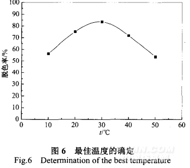 在三氯化鐵投加量為200 mg/L,皂土投加量為1 g/L,pH為 7,活性藏青廢水初始濃度為10 mg/L的條件下,考察混凝溫度對 處理廢水過程的影響,結(jié)果如圖6所示。由圖6可見反應溫度由 10℃增高至50℃,色度的去除率逐漸增加,但增幅不大;溫度 高于30℃后去除率反而下降。這可能是因為適當?shù)臏囟瓤梢约铀?反應。溫度升高,反應速度加快,使得去除率提高,但也會抑制 三氯化鐵的作用,溫度越高三氯化鐵越難發(fā)揮作用,導致脫色率 下降J。本試驗表明在10-50℃的較寬溫度范圍內(nèi)脫色率能夠達 到滿意的降解效果,故本試驗中溫度控制在30℃左右,色度去除 率可達到86.3%。
