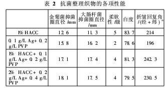 (2)納米Ag/HACC復合抗菌整理劑是利用納米Ag與HACC酰胺基間的分子識別,協同起殺菌作用。既提高了抗菌的耐久性、擴大了抗菌譜、增強了抑殺病菌效果,又降低了抗菌劑用量,且HACC還能賦予織物良好的吸水性、柔軟性、平滑性和回彈性。∞