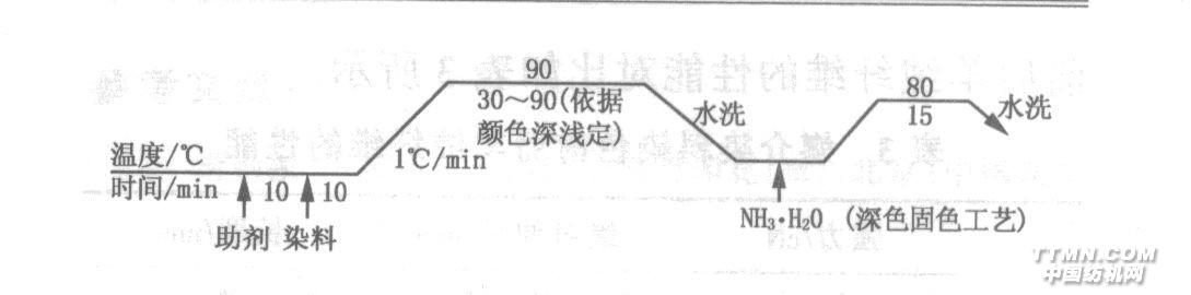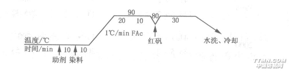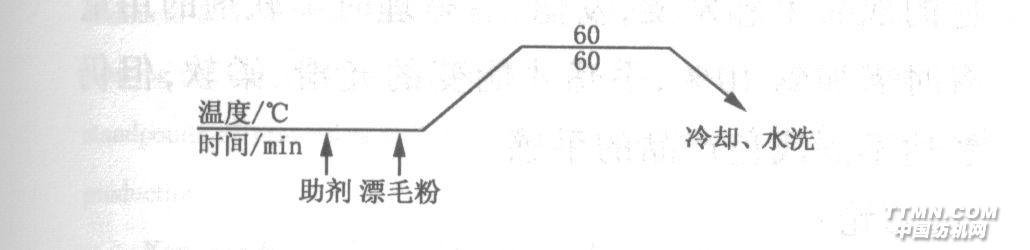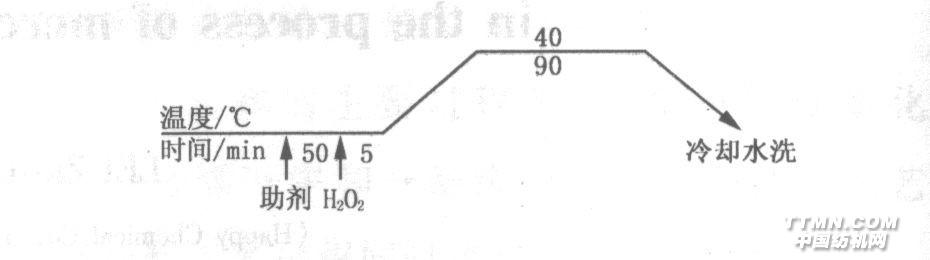 圖2還原漂白工藝曲線圖 漂毛粉是保險粉和焦磷酸鈉的混合物,保險粉遇水水解,釋放出新生態氫,靠新生態氫的還原作用破壞色素中的發色體結構,從而達到漂白的目的。但新生態氫在破壞發色體的同時也使羊絨纖維受損。2染色工序對羊絨纖維的損傷依據染