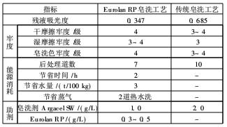 (1)EurolanRP的最佳皂洗條件為:EurolanRP用量0.4g/L,處理溫度85~90℃,pH值5~7,皂洗時間20min。