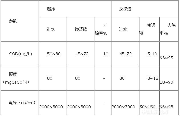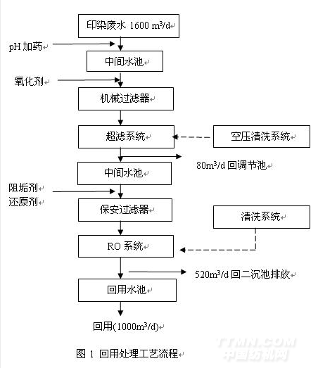 印染廢水經過任何處理已經后達到相應的排放標準。針對這一水源,并結合現在該公司的實際情況,要達到工業生產用水的要求,必須選擇膜法處理用作為主體工藝,并在反滲透系統前設置超濾系統對預處理后的水作進一步的處理,使反滲透系統進水的SDI小于3,極大地延長膜清洗周期,從而達到延長其運行壽命的目的。在采用膜處理回用前,為防止惡劣廢水的水質對膜運行產生的影響,為了保護反滲透膜安全穩定運行,在超濾膜前設置了機械過濾器去除廢水大部分的懸浮物后進入膜處理系統。