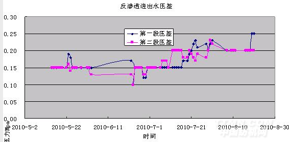 圖3 反滲透運行壓差從圖3中可知反滲透系統的原始壓差在0.15-0.20Mpa左右,經過3個半月左右的運行,壓差上升到在0.02-0.25Mpa左右,壓差增加了30%左右,需要進行化學清洗。采用自制的清洗藥劑進行清洗后,跨膜壓差穩定在0.2Mpa。從上圖可以看出隨著原水水質的波動,電導率不同造成進出水壓差存在較大的波動,但是整體壓差在3個月的時間內穩定上升。