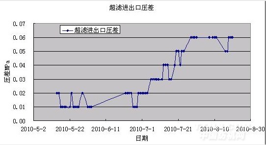 從表中可知超濾系統的原始壓差在0.01Mpa左右,經過3個半月左右的運行,壓差上升了0.05Mpa,未達到清洗的跨膜壓差,還是在正常情況下,不需要進行化學清洗。