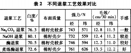 由表2知,煮練酶退漿工藝較適合麗賽/棉提花交織物。經另三種工藝退漿的半制品,除白度外,其它各項指標均低于煮練酶退漿半制品。對煮練酶退漿織物再進行氧漂處理,即能達到理想的白度。麗賽/棉提花交織物上含改性淀粉和化學混合漿料,采用煮練酶退漿可同時獲得退漿和煮練的效果。