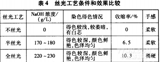 由表4看出,經半絲光和全絲光工藝處理后,染色織物的得色均較深,且顏色鮮艷,色澤均勻;但經全絲光工藝處理織物手感稍硬,門幅收縮大,擴幅困難。因此,宜采用半絲光工藝,絲光堿濃度為170一180g/L.