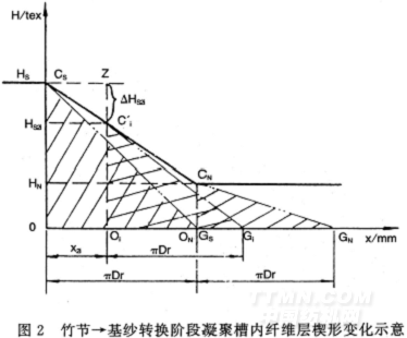 層的存在,故要實(shí)現(xiàn)從基紗一竹節(jié)全部纖維量堆積的轉(zhuǎn)換,必須待它們?nèi)勘粍冸x后才能完成,即經(jīng)過(guò)一個(gè)轉(zhuǎn)杯周長(zhǎng)周期才能實(shí)現(xiàn)從基紗一竹節(jié)的徹底轉(zhuǎn)換。同理,從竹節(jié)一基紗的轉(zhuǎn)換過(guò)程正好相反。無(wú)論是基紗一竹節(jié)還是竹節(jié)一基紗的轉(zhuǎn)換,都是一個(gè)平緩的漸變過(guò)程,轉(zhuǎn)杯紡所獲得的竹節(jié)呈兩頭細(xì)、中間粗、粗細(xì)平緩變化的長(zhǎng)竹節(jié)。