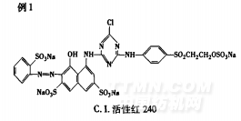 UO值=3320/720=4.61,兩者UO值差1.07染料分子質(zhì)量越小,乙烯砜取代硫酸酯后,元機性值下降所占比例越大,UO值相應下降越多。由例2和例3說明,含有硫酸酯乙基砜的ME型,EF型和KN型活性染料,在加堿固著時硫酸酯被消除,而轉(zhuǎn)化為乙烯砜時,UO值驟減,疏水性增加而造成瞬時吸附增大,常常會造成染色不勻現(xiàn)象。對于UO值較小的活性染料,硫酸酯轉(zhuǎn)化為乙烯砜過程中UO值降低,將造成染色更加不勻¨“,所以要選用UO值較大的染料。