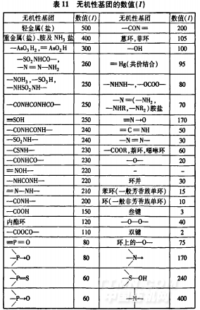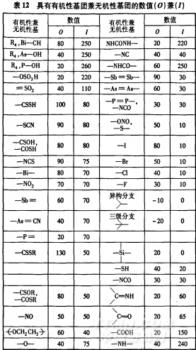 與有機性值相比,無機性值的確定就比較復雜。把醇類羥基的無機性值定為100,并以此為基礎(chǔ),決定其它取代部分的數(shù)值。具體無機性值的數(shù)值列于表11,而有些基團有有機性值也有無機性值,其數(shù)值列于表12。
