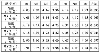 表5中,隨著染浴溫度的升高,染浴pH值也逐漸升高,這是因為溶液pH值隨溫度升高而升高。其方差顯示,加控制劑MYCH-151的數值均要較加醋酸的小,即前者的pH穩定性更好。因為前者是酸性緩沖劑,故對染浴pH值變化的抵抗作用更強。