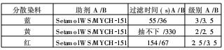 由表6知,控制劑MYCH-151的過濾時間要明顯短于分散劑SetamolWS。黃色染料用WS作分散劑抽濾時,甚至堵住了Buchner漏斗。此外,MYCH-151的分散性級別也要明顯高于后者0.5~1.0級。