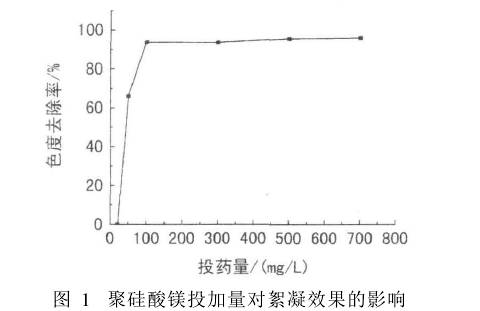 由圖1知,單獨加入粉煤灰或聚硅酸鎂,處理效果不好。聚硅酸鎂投藥量為100 mg/L時,色度去除率達到93. 9%;繼續加大投藥量,色度去除率變化不明顯。