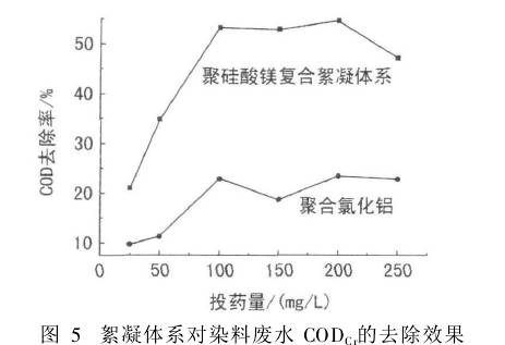 圖5表明,采用聚硅酸鎂復合絮凝體系處理印染廢水,CODCr去除效果優于市售聚合氯化鋁,投藥量小,CODCr去除率高。