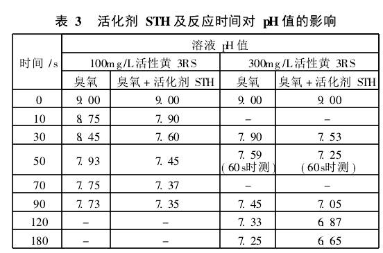在臭氧氧化活性染液時,活化劑STH的加入對溶液pH值的影響見表3。