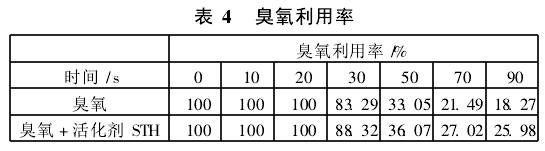 加入活化劑STH后,臭氧氧化反應30~90 s,臭氧利用率比對照樣提高5% ~8%, 90 s后利用率仍有25. 98%。這說明活化劑STH的加入,有助于減緩臭氧無效分解和氧氣逸出,提高臭氧利用率。